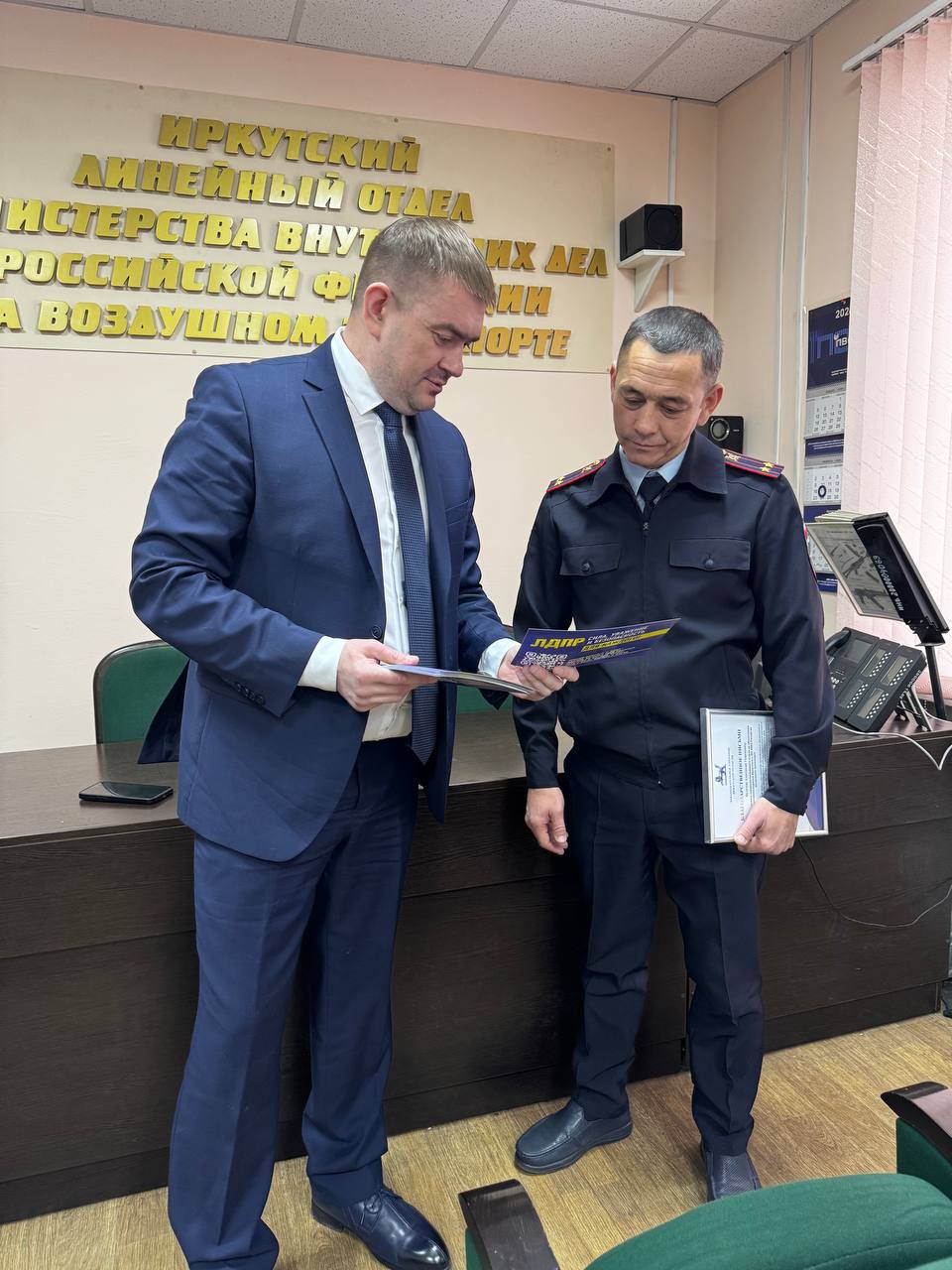 В День работников транспортной полиции представители ЛДПР посетили линейный отдел МВД Иркутского аэропорта и поздравили тех, кто обеспечивает порядок на одном из главных транспортных узлов региона.